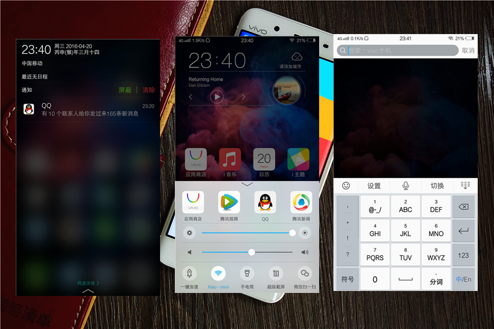在系统主界面,从屏幕顶部下滑是系统通知栏界面,从屏幕底端上滑是快捷工具栏和近期任务的综合界面,在屏幕中间空白处上滑即可进入到全局搜索界面。FuntouchOS还直接将“微信扫一扫”集成到了系统的快捷工具栏中,无需开启微信就能直接进行“扫一扫”操作。