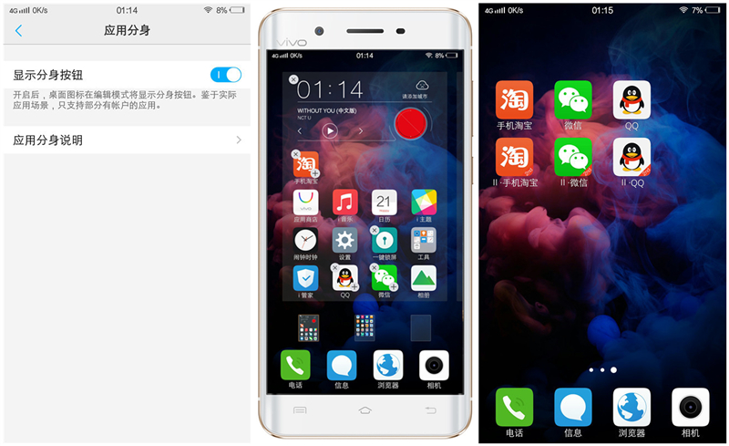 vivo Xplay5手机还有一个“应用分身”功能,开启方法也和其他系统中的有所不同,需要先在设置选项中开启“应用分身”功能,然后长按应用图标,如果图标右下方有“+”号的话,就说明此应用可以进行分身功能。开启“应用分身”之后,在桌面上就会出现两个QQ或者两个微信图标了,可以同时登陆两个QQ号码或微信号码,而且还支持淘宝分身,可以同时登陆两个淘宝账号,目前此功能只支持这三个应用。